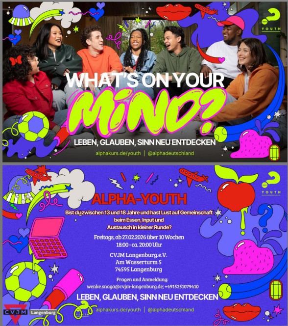 Wichtige Änderung beim Alpha-Youth-Kurs: immer Freitags, Start: 27.02.2026Wenn du zwischen 13 und 18 Jahre bist, dann bist du herzlich eingeladen zu unserer Alpha-Youth-Series.Hier bekommst du gutes Essen in guter Gemeinschaft, guten Input und hast die Möglichkeit zu persönlichen Austausch.Wir freuen uns auf dich!Gaby, Wenke und Team.